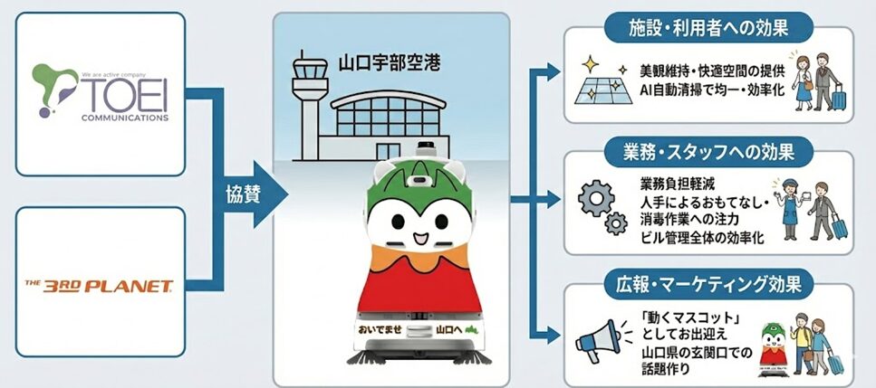 株式会社東映コミュニケーションズおよび株式会社サードプラネットは、山口宇部空港(山口県宇部市)国内線ターミナルビル内において、山口県PR本部長「ちょるる」のデザインを施した自律走行型清掃ロボットの導入に協賛いたしました。